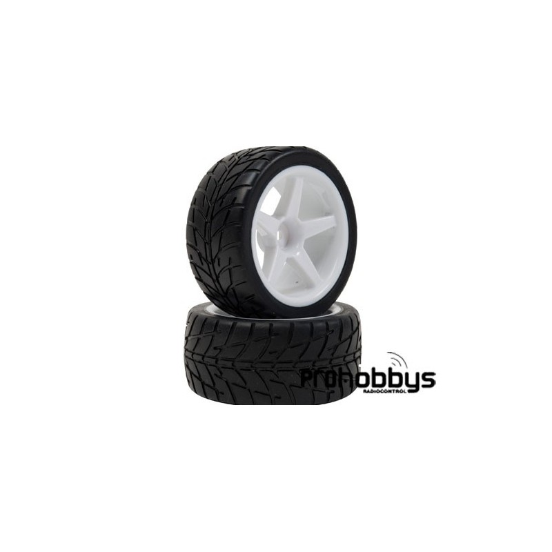 Las ruedas pegadas y montadas sobre llantas de 5radios están hechas con un perfil bajo para pista. Los agujeros de ventilación en la llanta previenen saltos no deseados en el coche.